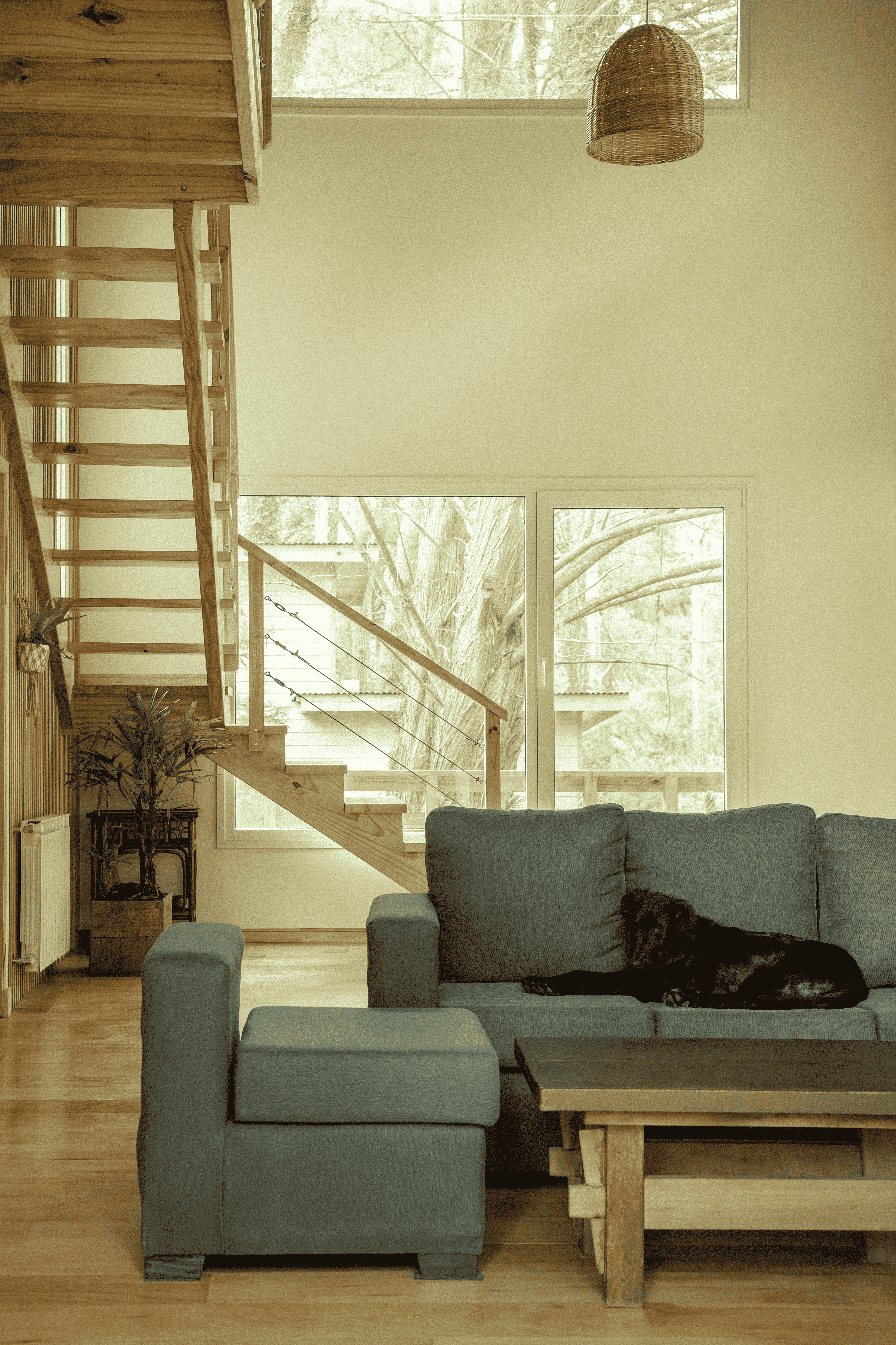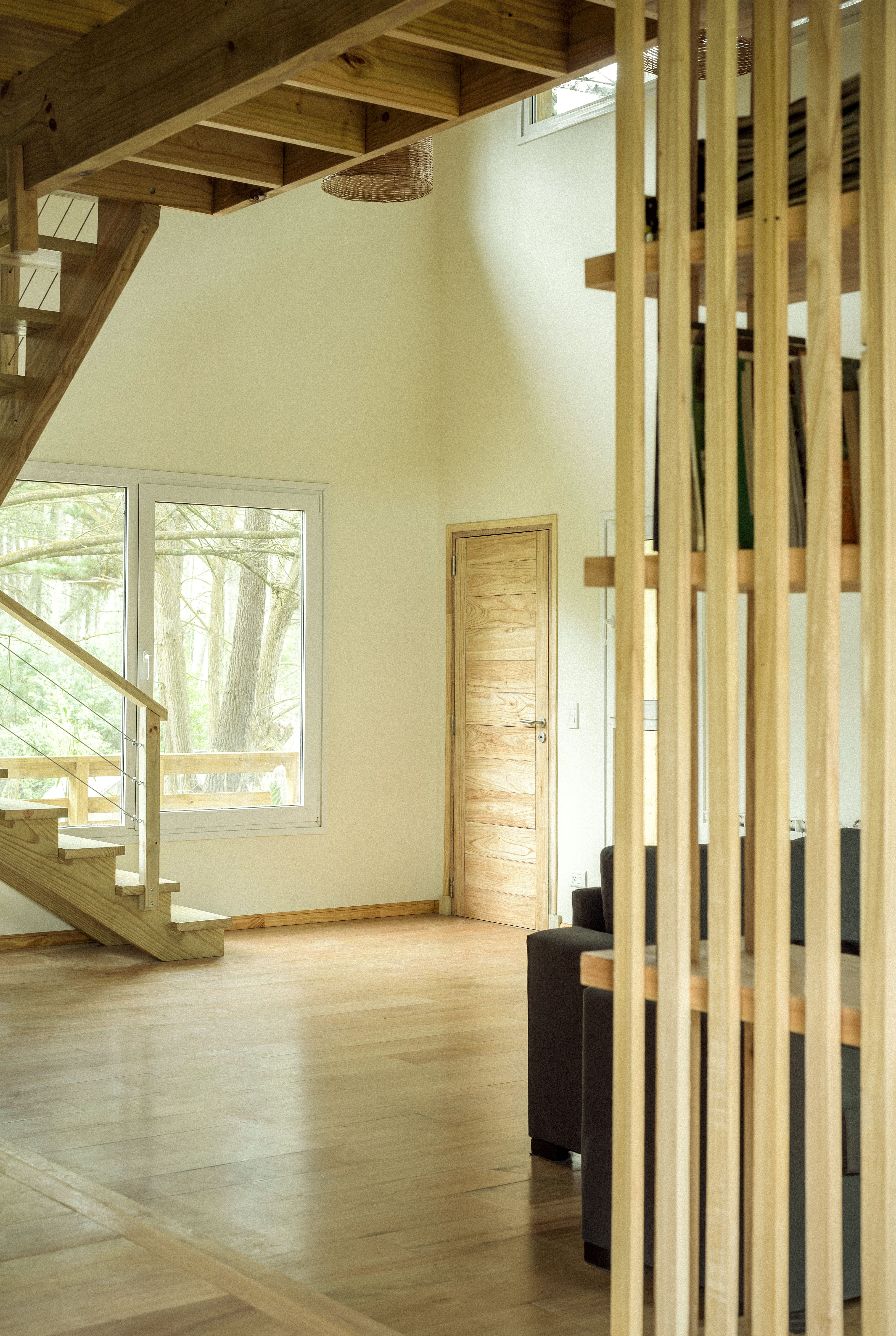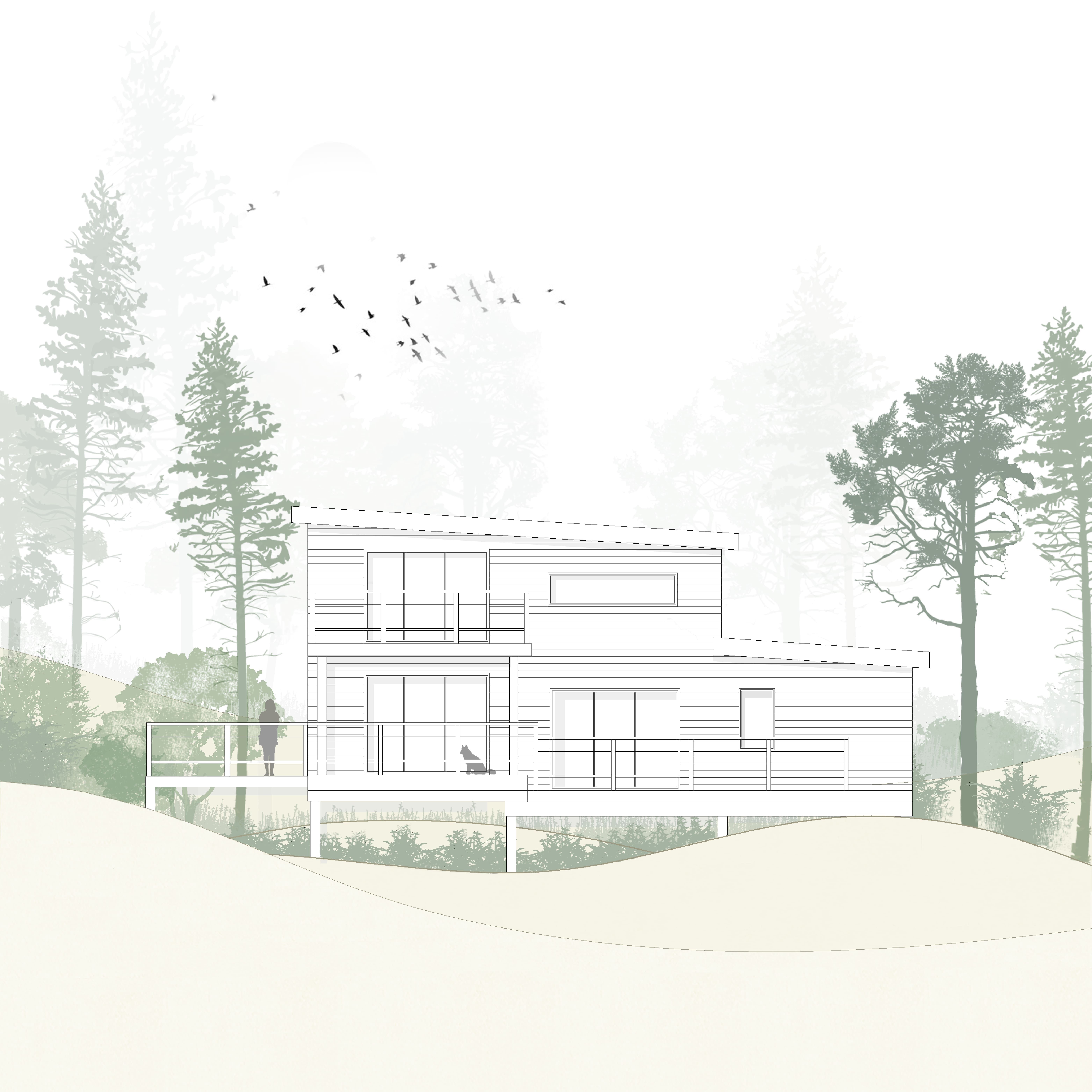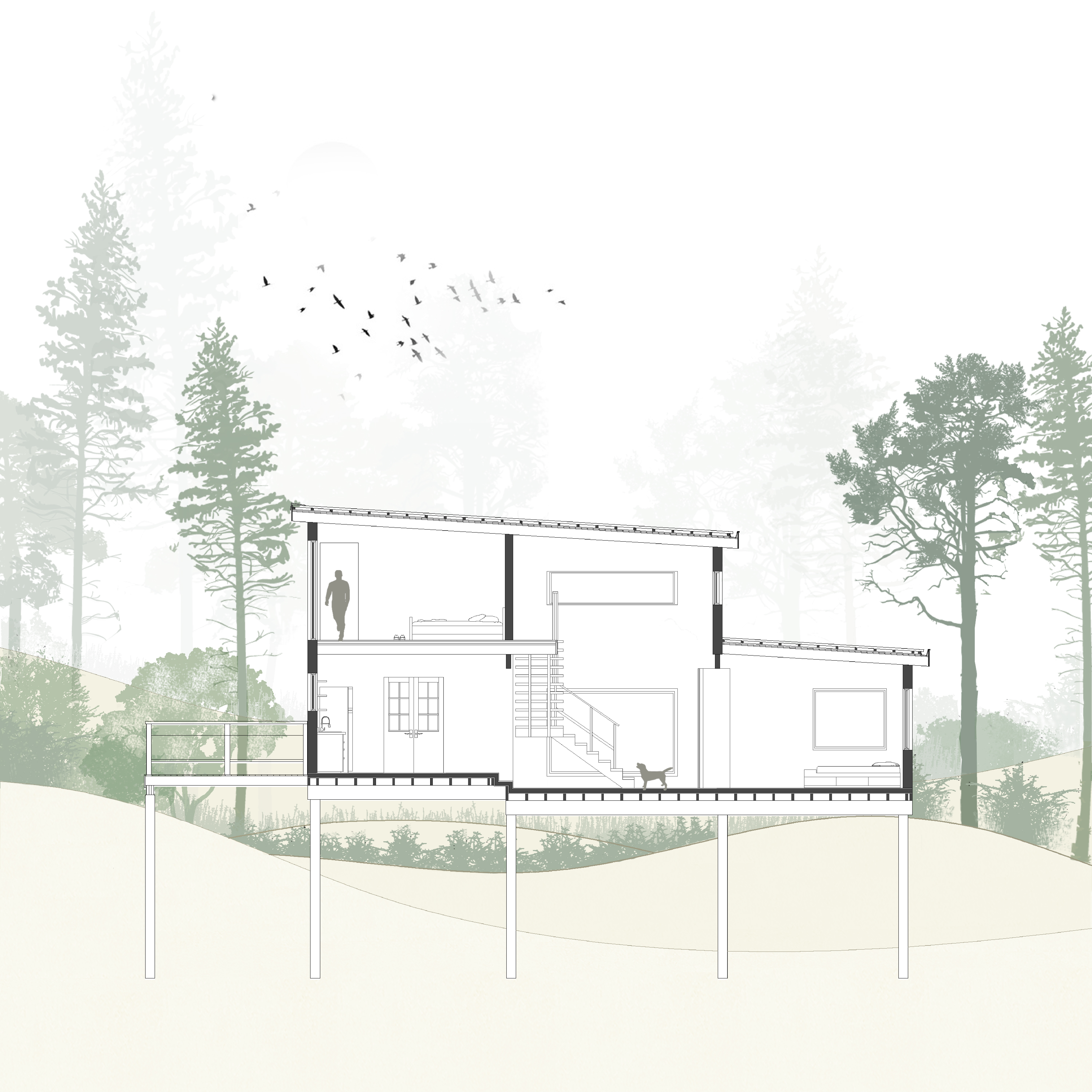 El terreno con alteraciones en el terreno y la verticalidad de los árboles nativos del lugar nos propuso elevar la casa generando la idea de estar en el bosque. La elevación permite remarcar esa relación con el sitio, la idea que la obra crezca en conjunto con los árboles, entender el espacio como una continuidad entre el exterior y el interior.
