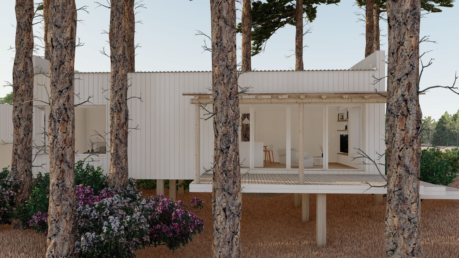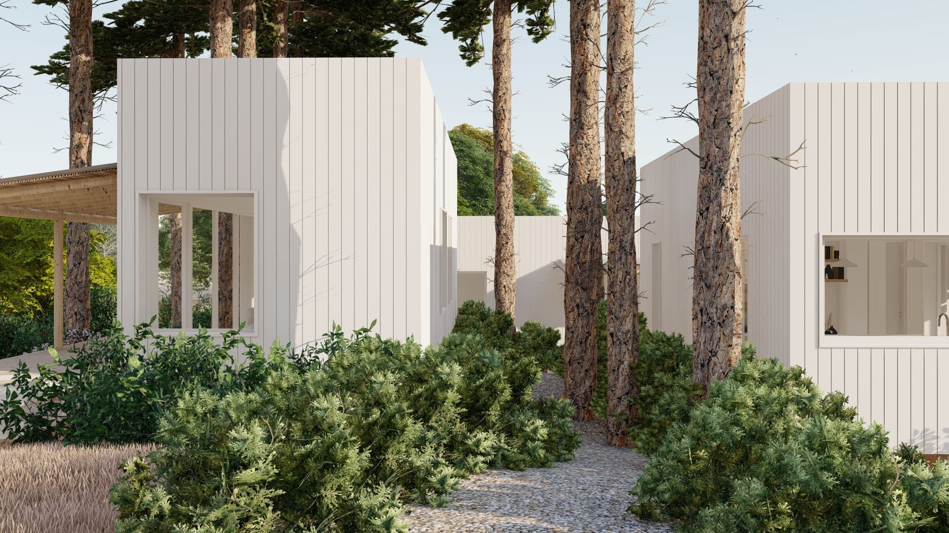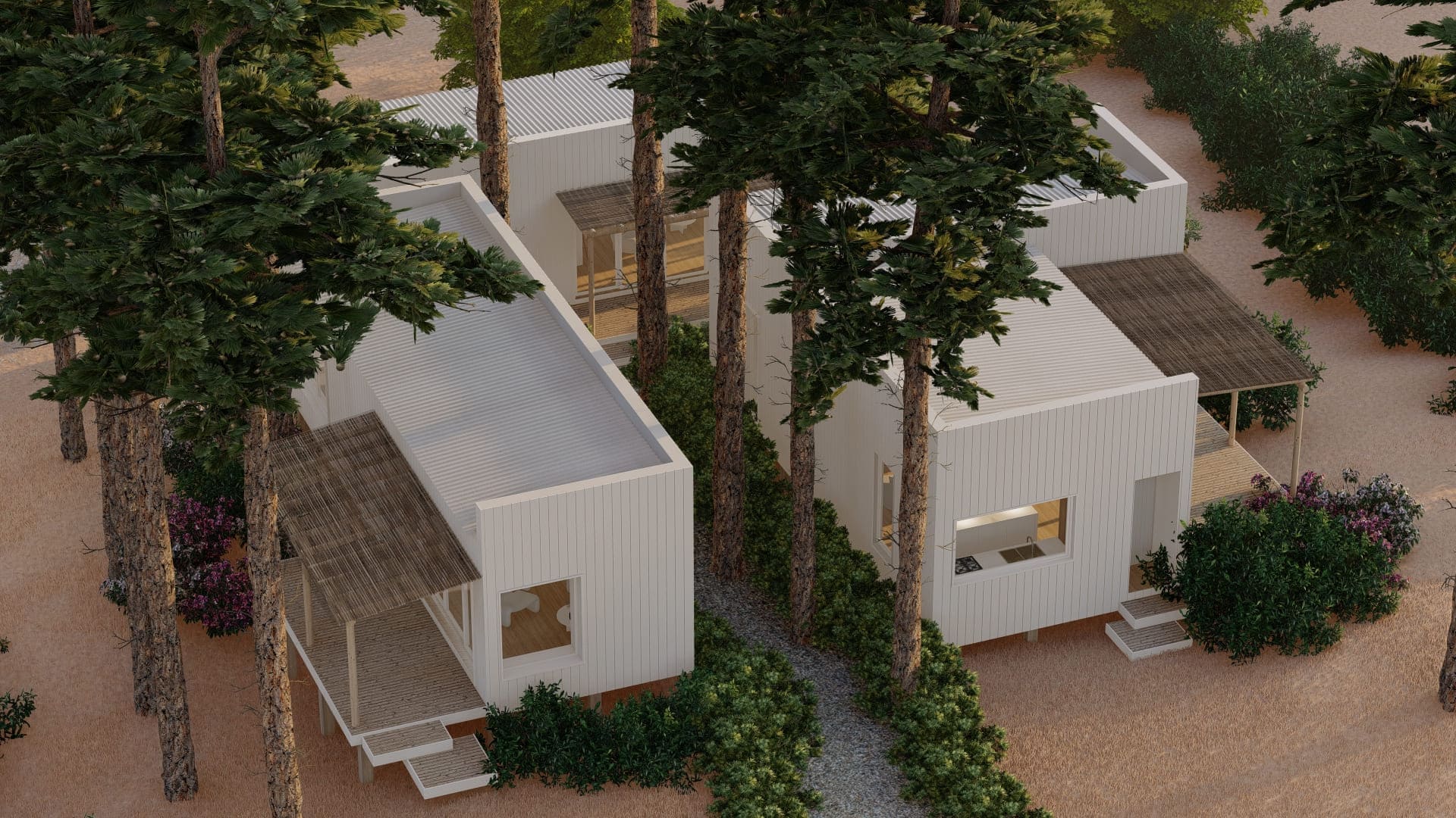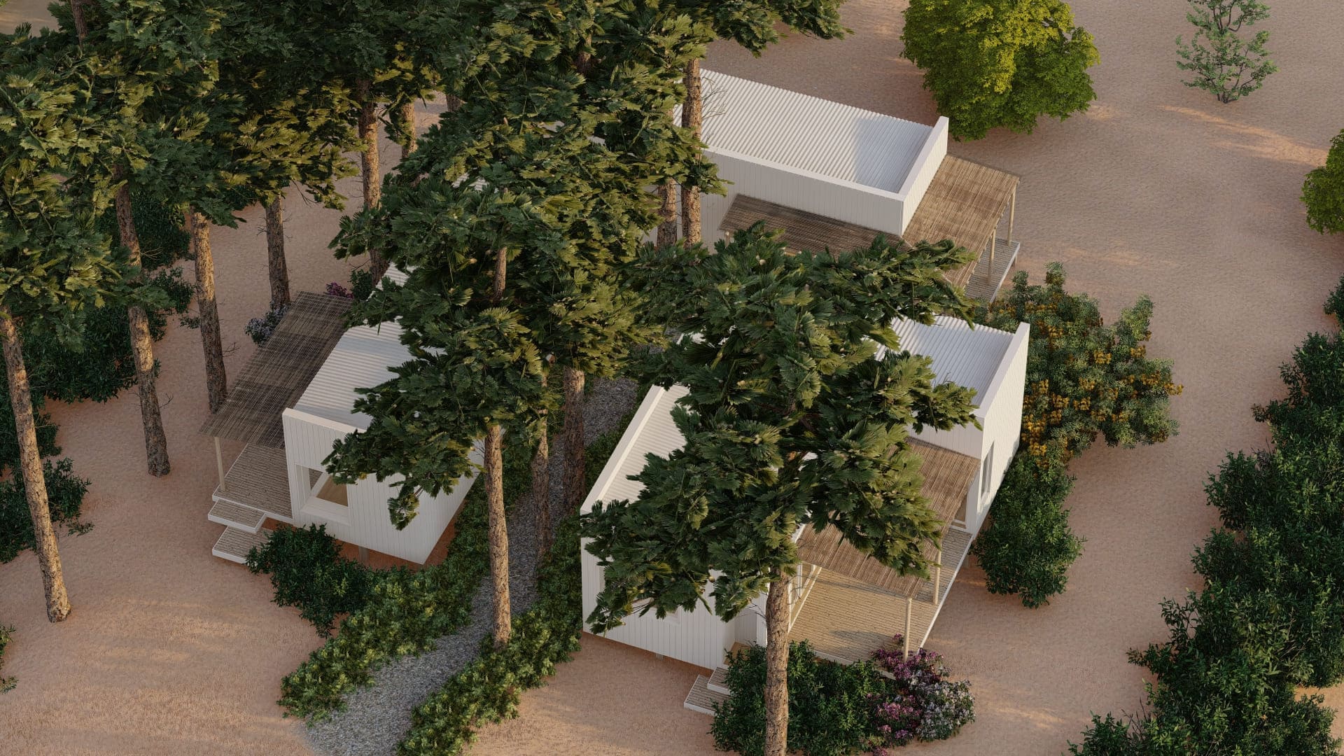Este proyecto fue diseñado para un terreno irregular en Mar de Las Pampas, provincia de Buenos Aires. Se pensó un complejo multifamiliar de viviendas de entre 40 y 60m2 generando a través del paisaje y los árboles un recorrido y acceso a las mismas.
